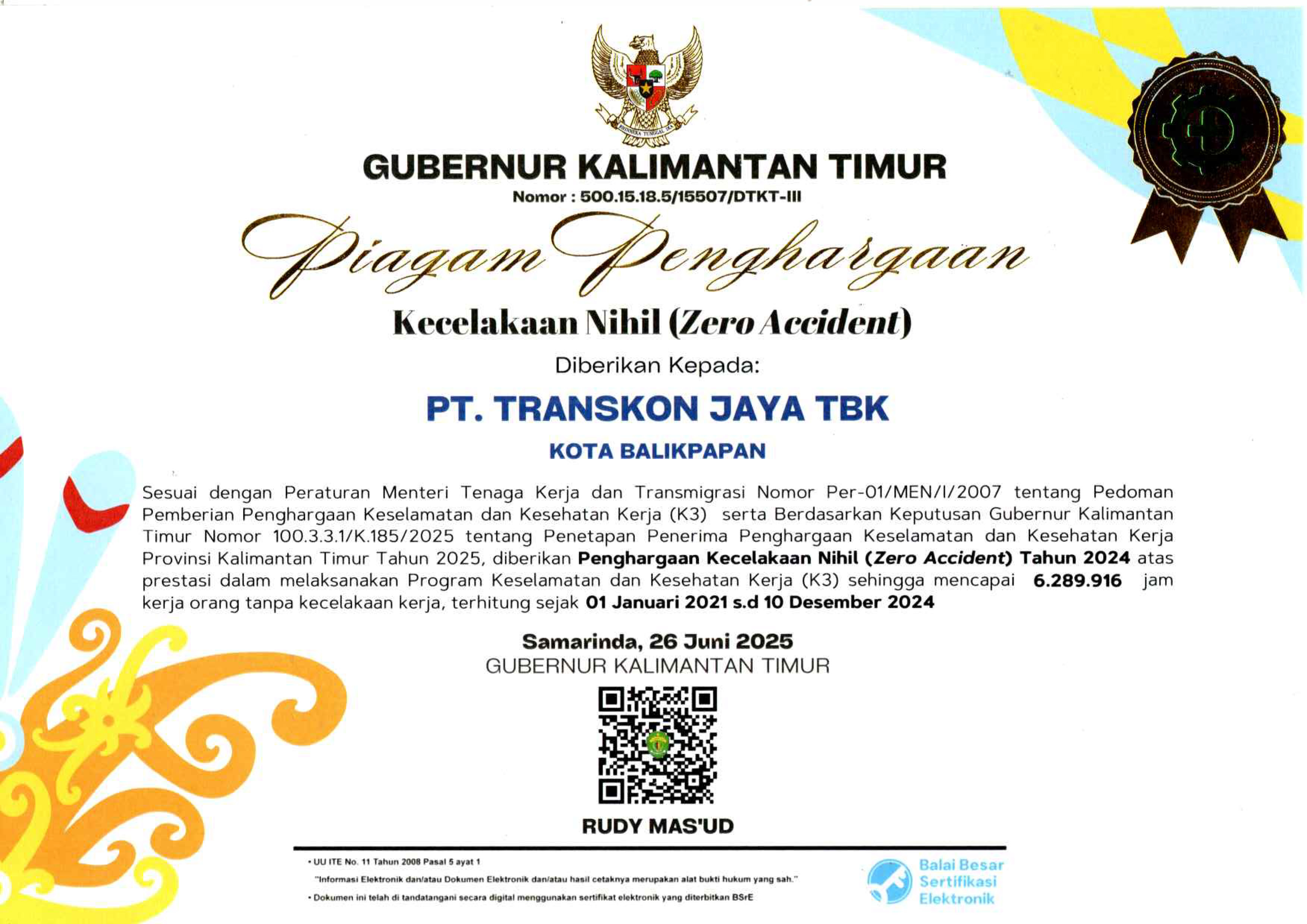 (11-nov-2025) Transkon raih penghargaan kecelakaan nihil (zero accident) dari gubernur kalimantan timur